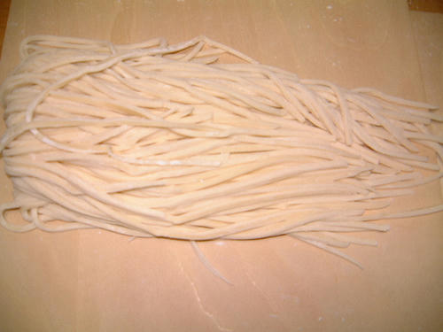 今回は水回しから丁寧に行い、一時間冷蔵庫で寝かせた後(部屋に置いていると醗酵しすぎます)、こね工房君に頼ること無く我が手で全て行いました(足も使うし、カットは麺切台だが・・・)