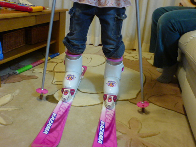 家の娘のスキーセット。お約束?通り板、ストック、ブーツはKAZAMAウェアはポイントスクエアというアルペン系バレバレセット(笑)で揃えました。実はスキー場で一番多いセットとも言う。